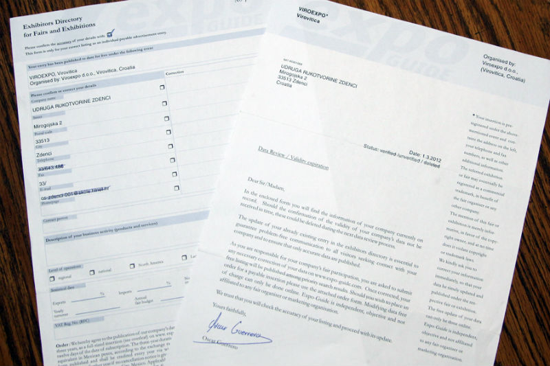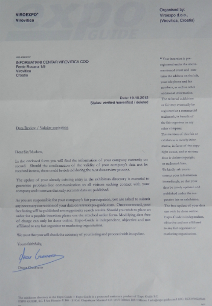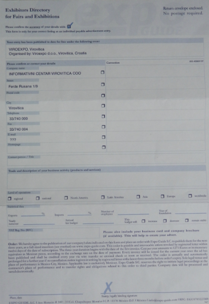 Na poštanske adrese pojedinih izlagača Međunarodnog sajma gospodarstva, obrtništva i poljoprivrede Viroexpo, pa tako i na adresu Informativnog centra Virovitica u sklopu kojeg se nalazi Radio Virovitica, Virovitički list i Internet portal www.icv.hr, stigla je ponuda koja poziva na suradnju. U zaglavlju istog spominje se tvrtka Viroexpo d.o.o. te u potpisu izvjesni Oscar Guerrero,. S navedenim tvrtka Viroexpo d.o.o. kojoj je sjedište u Virovitici, nema nikakve veze. Radi se o obmani kojom se želi iskoristiti tvrtka Viroexpo i sam sajam Viroexpo kako bi se od izlagača, pod krinkom suradnje, izvukla određena financijska korist u iznosu od 1.271 eura. Tvrtka Viroexpo d.o.o. već je poduzela određene pravne korake kako se njeno ime ne bi provlačilo iza možebitnih transakcija. Iza svega stoji tvrtka koja se krije na sljedećoj Internet adresi http://www.expo-guide.com/index.php, a primjer pokušaja malverzacijama s imenom Viroexpo, može se vidjeti i u primicima ove vijesti. (www.icv.hr)