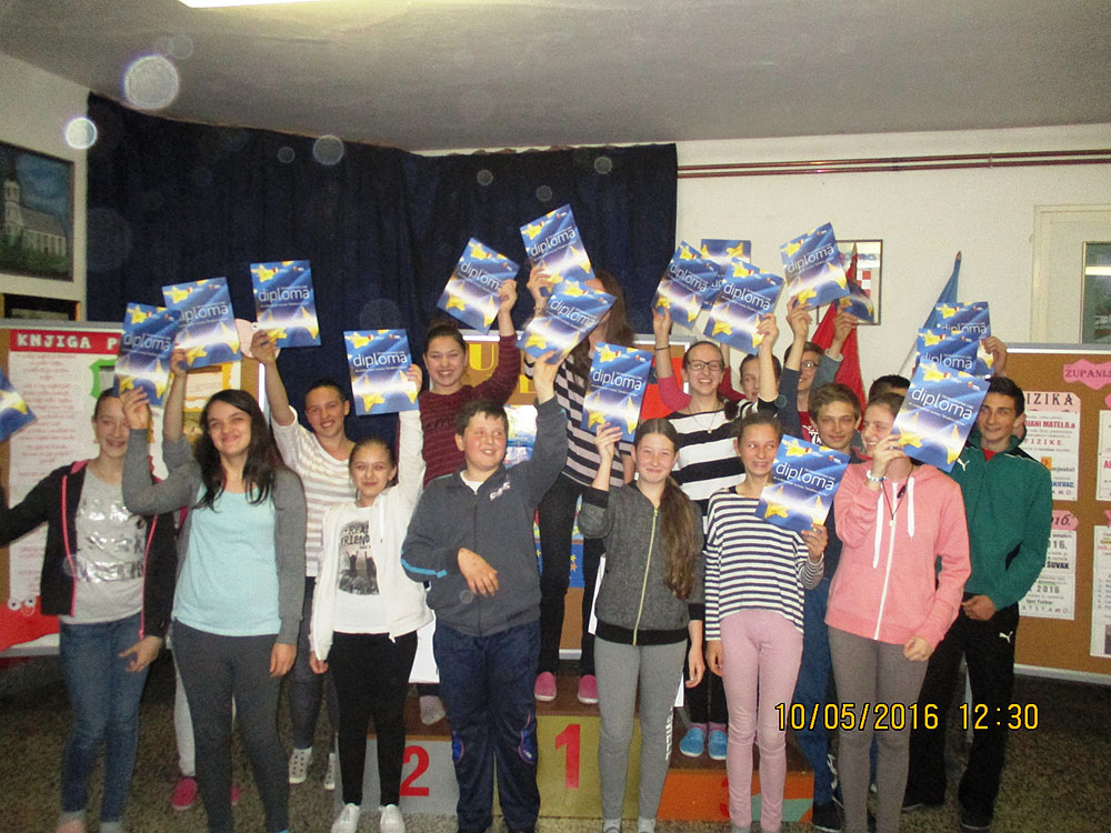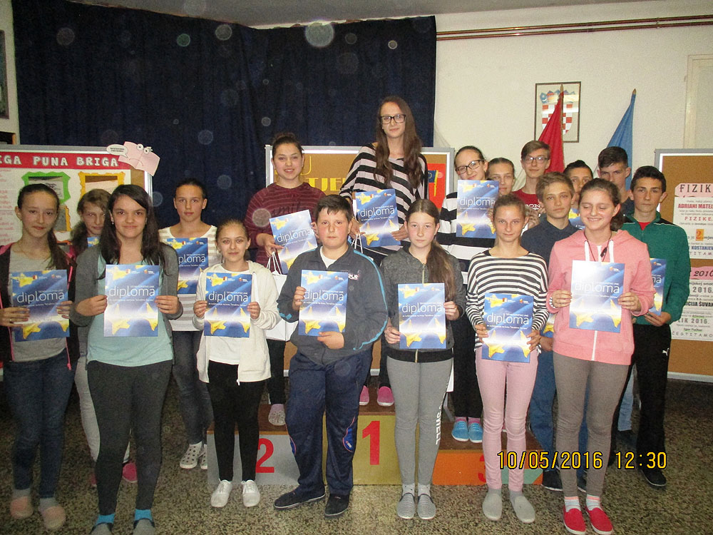 Pobjedničku trojku iz Gornjeg Bazja predvodila je Matea Merkaš, ispred Ariele Malenice i Sare Radmanić. Na kvizu na kojem se tražilo poznavanje Europske unije, još su nastupili: Patricija Ribić, Roko Piljek, Laura Kiralj, Patrik Bauman, Luka Špoljar, Karlo Bilić, Katarina Han, Filip Đurčević, Lara Pleše, Daria Hajba, Krunoslav Dijak, Domagoj Radić i Ronald Jagica. Prigodne poklone najboljima i diplome sudionicama, uručile su službenice Virovitičko-podravske županije Sanja Sabolić, Martina Otročak i Andreja Dobrostal Šegregur, uz nazočnost ravnatelja OŠ Ivan Goran Kovačić, Saše Topića.