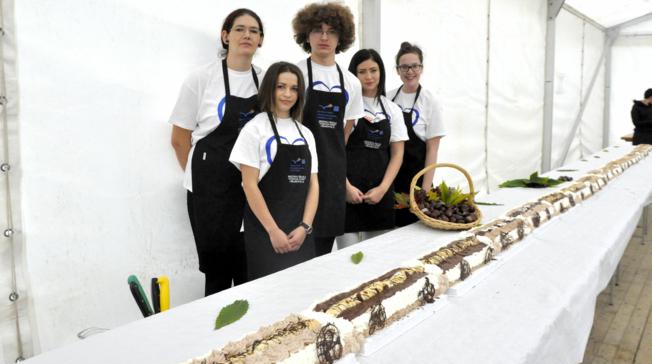 – Inače, za dvanaestmetarsku tortu bilo je potrebno 25 kilograma kesten-pirea, 150 jaja, 20 litara šlaga i 6 kilograma čokolade, a šećer uopće nismo koristili jer je kesten bio dovoljno sladak. Za pripremu je bilo potrebno otprilike deset sati rada. Ovo je učenicima bio dio praktične nastave i treba reći da su oni svi kuhari, dakle ne slastičari, a njih šestero ovaj su posao odradili savršeno”, rekla je Danira Vinković, nastavnica kuharstva u SŠ Stjepana Ivšića Orahovica. (www.vpz.hr, vg, Fotografije: Vladimir Grgurić)