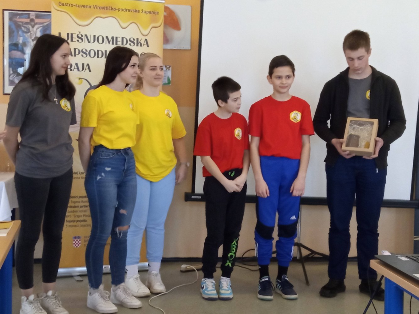 Učenici su zatim degustirali bagremov, lipov i cvjetni med te su ga ocjenjivali. Najbolju ocjenu dobio je bagremov med, dok su lipa i cvjetni med imali izjednačen broj bodova. Odabrani med u dogovoru s našom slastičarskom reprezentativkom Sandrom Jadek trebao bi poslužiti na sljedećim radionicama kao podloga za izradu gastro suvenira Virovitičko-podravske županije – slatkiša-lizalice od meda, lješnjaka i čokolade.