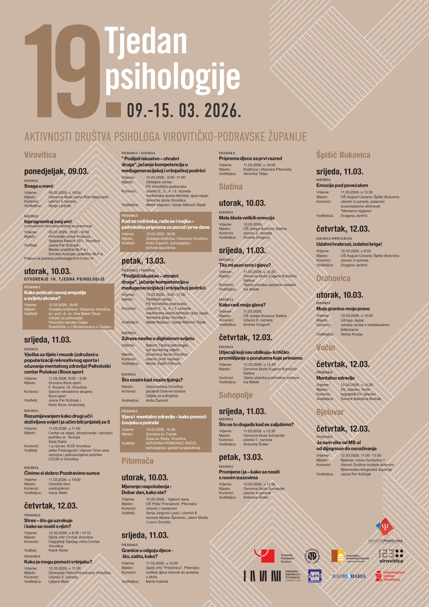 Ponovno su na red došli dani, točnije tjedan, kada psihologija izlazi iz stručnih kabineta i ulazi među sve generacije – u utorak, 10. ožujka, u Gradskoj knjižnici i čitaonici Virovitica započeo je 19. Tjedan psihologije. Predavanja, radionice i javni razgovori koji otvaraju teme kao što su mentalno zdravlje, razvoj djece i mladih, emocionalne vještine, odnosi među vršnjacima, roditeljstvo te izazovi digitalnog okruženja i ove godine okupljaju djecu, mlade, roditelje i stručnjake od 9. do 15. ožujka u više gradova i općina diljem VPŽ – od Virovitice, Slatine, Pitomače i Suhopolja, sve do Špišić Bukovice, Orahovice i Voćina.