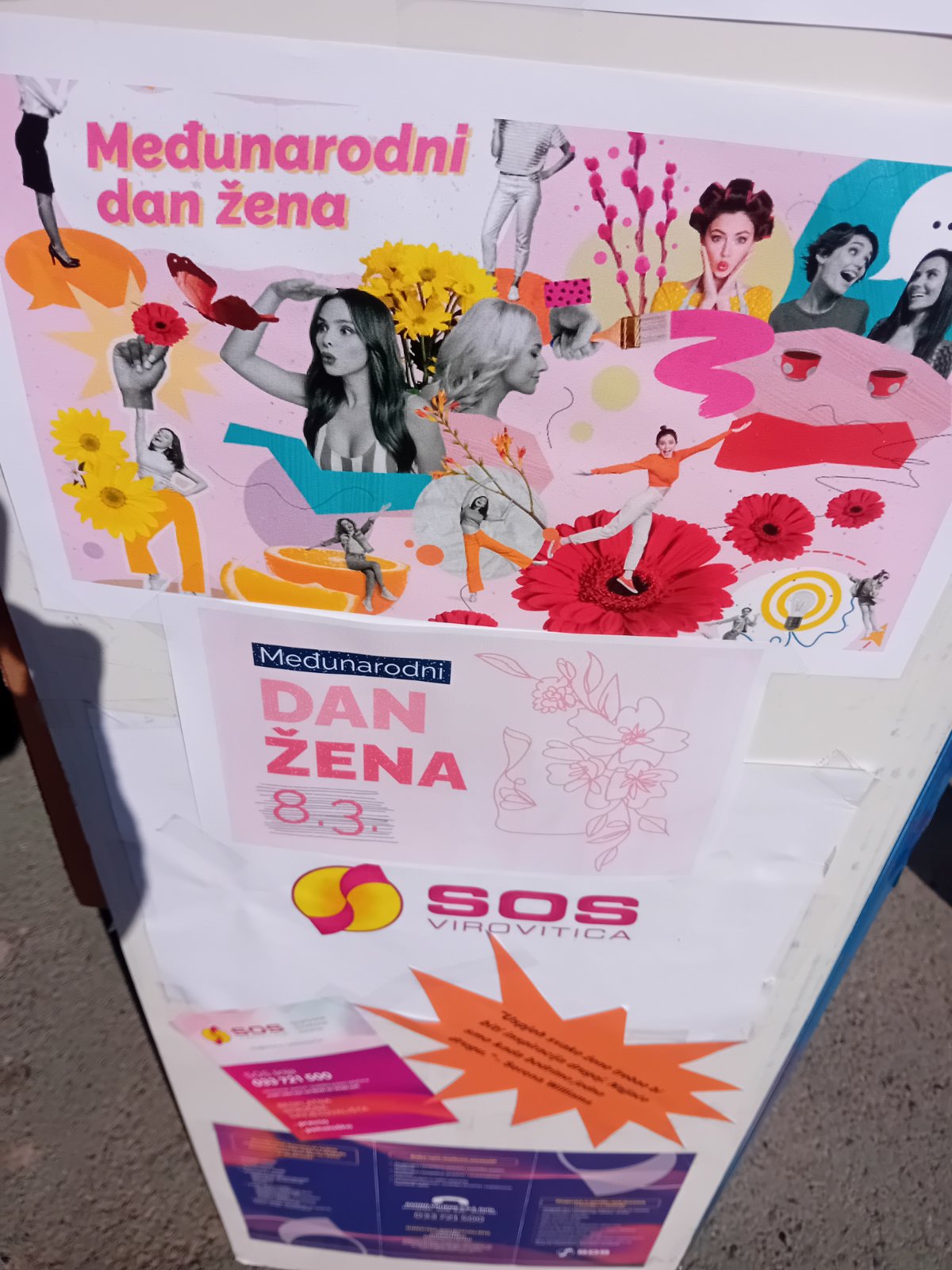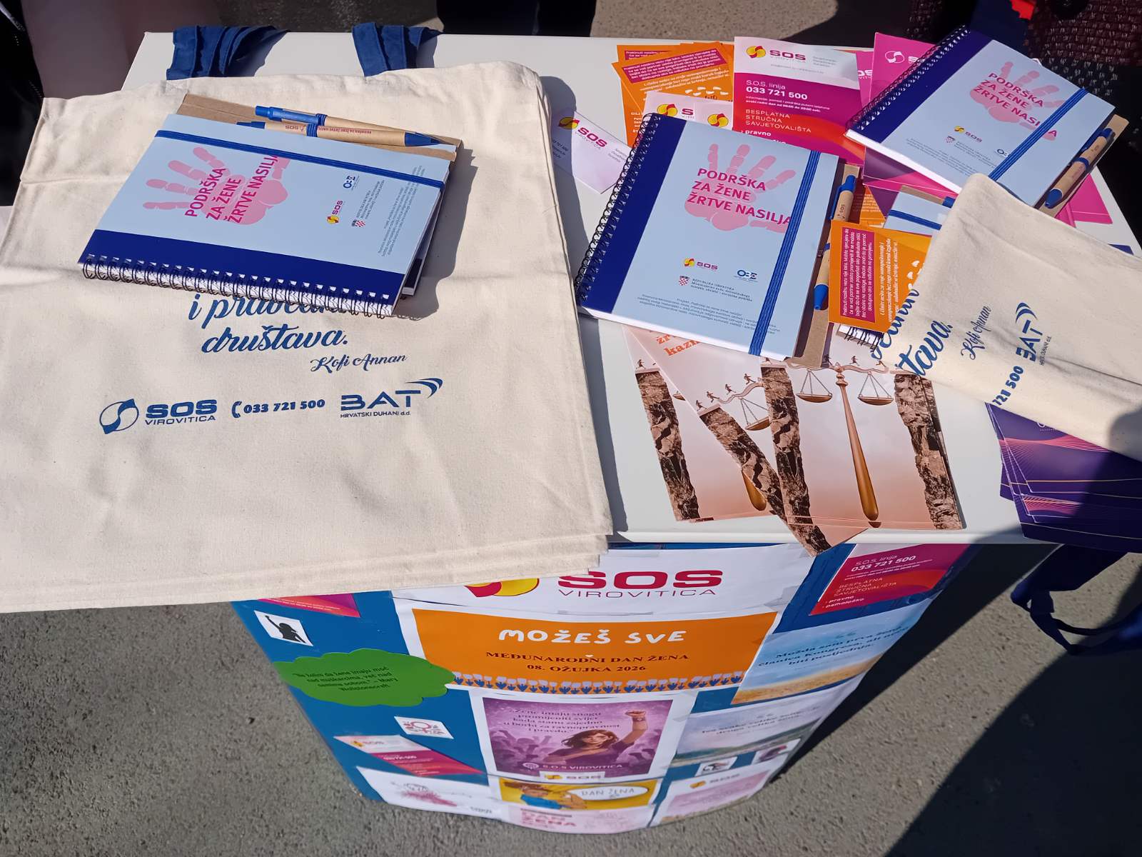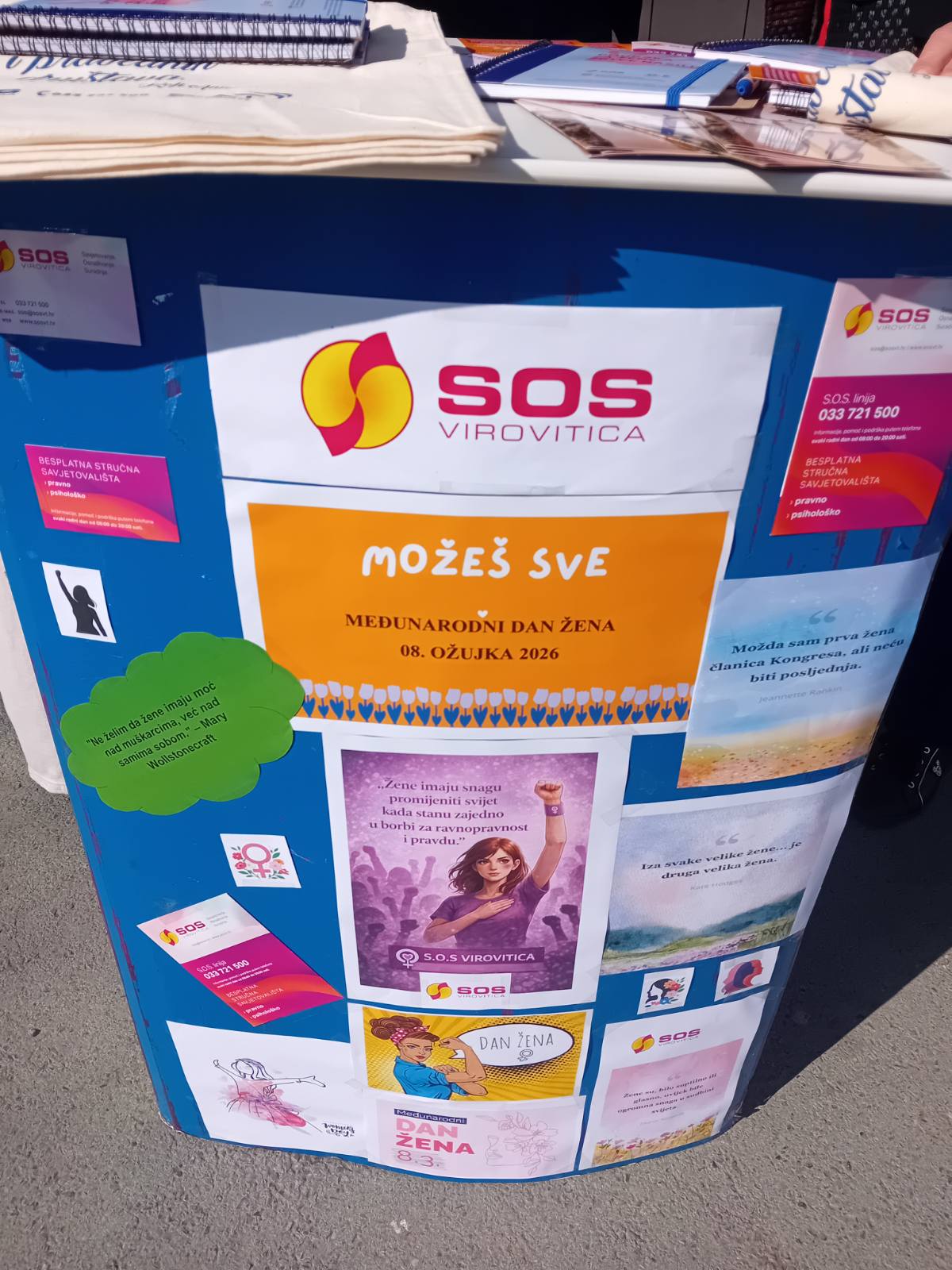 Udruga S.O.S Virovitica organizirala je javnu akciju podjele promotivnih i informativnih materijala povodom Međunarodnog dana žena, 8. ožujka, ispred Gradske tržnice Virovitica u vremenskom razdoblju od 10:30 do 11:30 sati.