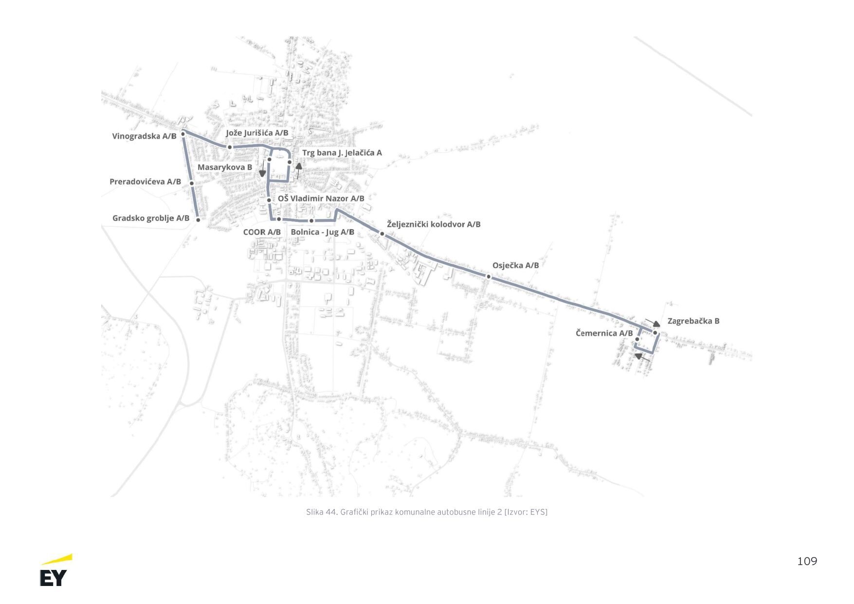 Linija 2 također polazi iz središta grada te se preko Masarykove i Trga bana Jelačića usmjerava prema bolnici i dalje prema istočnom dijelu grada. Ruta uključuje Osječku i Zagrebačku ulicu te završava u području Čemernice, čime se osigurava povezanost grada s tim prigradskim naseljem. Prometovat će radnim danima od 6:30 do 22:00 sata.