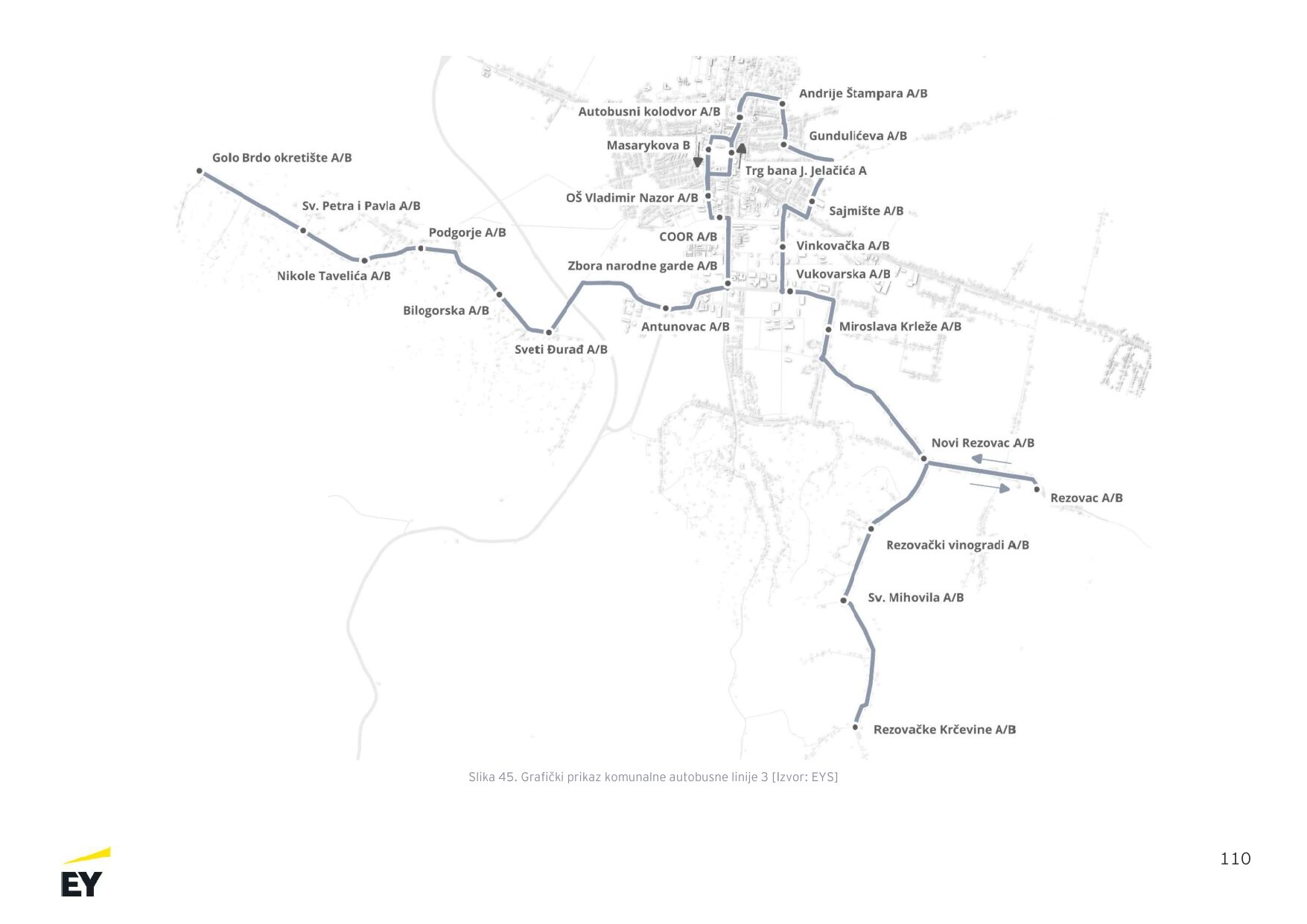 Linija 3 pokriva južni i jugoistočni dio grada te prigradska naselja i to radnim danima od 6:00 do 21:00 sat. Iz središta grada vodi preko Vinkovačke i Vukovarske ulice prema Rezovcu i Rezovačkim Krčevinama. U suprotnom smjeru obuhvaća i dio prema Podgorju i Golom Brdu.