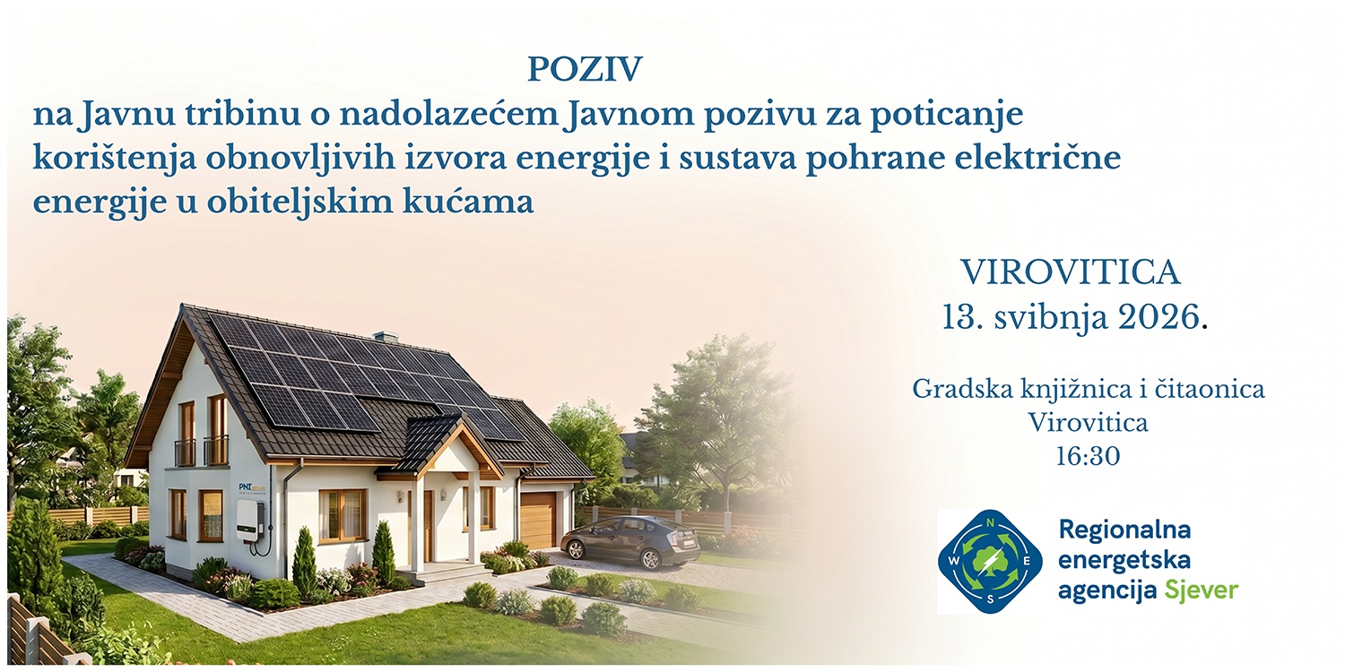 Regionalna energetska agencija Sjever poziva zainteresirane građane Virovitice na javnu tribinu o nadolazećem Javnom pozivu za poticanje korištenja obnovljivih izvora energije i sustava pohrane električne energije u obiteljskim kućama.